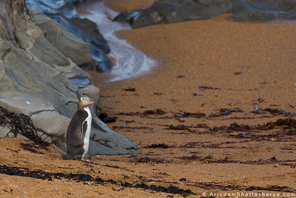 Endangered Yellow Eyed Penguin or Megadyptes antipodes at New Zealand